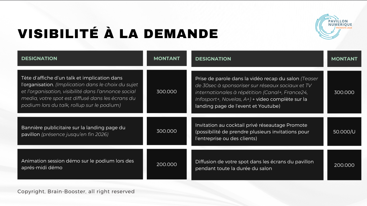 Brain-Booster, mandant de l’organisation du Pavillon Numérique pour la seconde édition, est un Accélérateur d’Entreprises spécialisé dans la communication stratégique et la digitalisation des processus métiers.